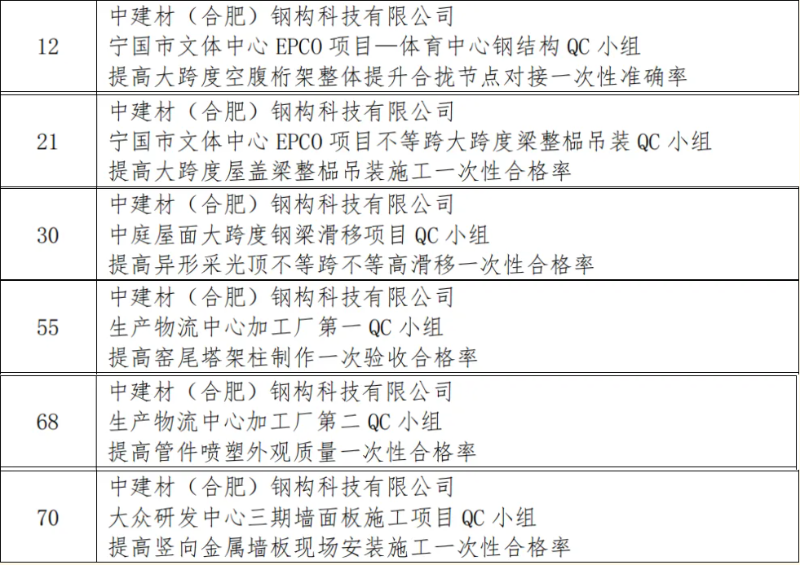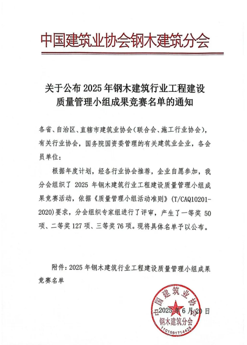 近日,在中國(guó)建筑業(yè)協(xié)會(huì)鋼木建筑分會(huì)主辦的2025年鋼木建筑行業(yè)工程建設(shè)質(zhì)量管理小組成果競(jìng)賽中,中建材鋼構(gòu)公司憑借卓越的質(zhì)量管理成果和創(chuàng)新實(shí)踐,一舉斬獲多項(xiàng)榮譽(yù),充分彰顯了其在行業(yè)內(nèi)的領(lǐng)先地位和綜合實(shí)力。